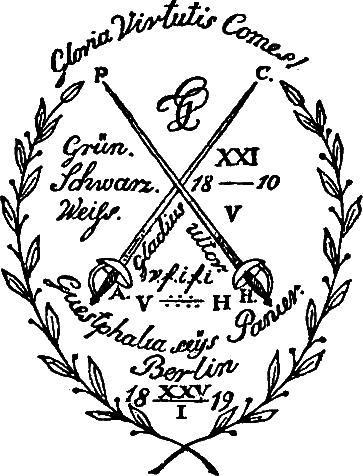 Großes Bundeszeichen des Corps Guestphalia Berlin (bestand von 1810 bis 1821), zeigt den Lorbeerkranz mit zwei gekreuzten Glockenschlägern, im oberen Feld den Zirkel, rechts das Gründungsdatum XXI.V.1810, unten den Wappenspruch "Gladius ultor" und den abgekürzten Wappenspruch v.f.i.f.i. ("vivant fratres intimo foedere iuncti") sowie den "Punktbruch" mit drei Punkten oben für die drei Chargierten und vier Punkten unten für die restlichen Gründungsburschen, links und rechts vom Punktbruch die Buchstaben "V" und "H" für "Vivat Haaser" (Huldigung an den Gründer des Corps), im linken Feld die Farben "Grün.Schwarz.Weiss", das Datum ganz unten (XXV.I.1819) ist ein Rekonstitutionsdatum.