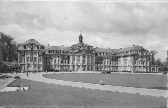 Das Schloß mit den zwei vorgelagerten Wachhäuschen (Kavaliershäuschen) entstand anstelle der 1764 niedergelegten Zitadelle. 1767 begann Schlaun den Bau für den Fürstbischof. Er erlebte die Fertigstellung aber nicht, da er 1773 verstarb. Für ihn führte Wilhelm Ferdinand Lipper die Arbeiten fort, die 1787 beendet wurden. Es entstand eine barocke Dreiflügelanlage, die in der typischen Form Schlauns, der Kombination von rotem Back- und gelbem Sandstein, errichtet wurde. Der Bischof nutzte das Schloß allerdings selten, schon 1802 wurde Münster besetzt und das Fürsbistum 1803 säkularisiert. 1945 brannte das Schloß komplett aus und wurde bis 1950 mit geändertem Dach wieder aufgebaut. Die Innenräume wurden funktionell und sehr schlicht gestaltet. Heute wird das Gebäude von der Universität genutzt und beherbergt unter anderem die Uni-Verwaltung und eine Reihe von Hörsälen.