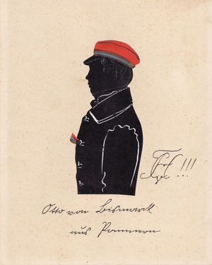 Otto von Bismarck als Student in Couleur seines Corps Hannovera Göttingen. Reproduktion des zeitgenössischen Scherenschnitts von 1832 im Besitz des Corps Hannovera