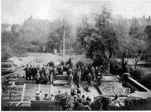 Inschrift im Grundstein des Mk-Hauses: ERECTA MCMXI EREPTA MCMXXXVIII DESTRUCTA MCMXLV CORRUPTA MCMXLV REDUCTA MCML CONSTRUCTA MCMLIV STO MEIS
