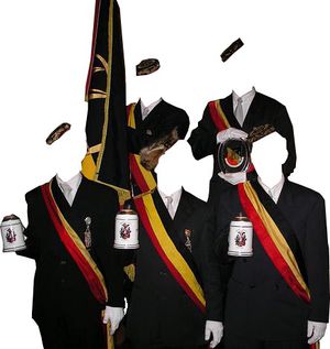 Drei Chargierte mit Fahnenträger und Bierfuchs