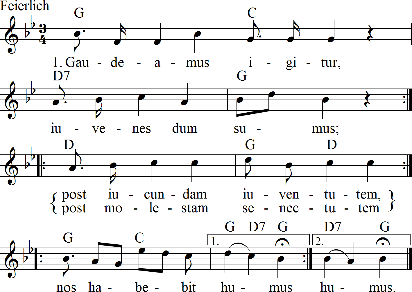 Gaudemus igitur ist der urstudentischste aller Cantus und fester Bestandteil nahezu aller Kommerse oder Kneipen. Häufig werden Begrüßungen zu Beginn der Veranstaltung entsprechend in das Lied eingebettet. Der sechsten Strophe wird eine ähnliche Bedeutung wie der Nationalhymne zugestanden, was sich darin äußerst, dass die Chargierten sich zu der Strophe erheben und grüßen. Die letzte Strophe wird in der Regel durcheinander und unrythmisch gesungen, um sozusagen den Teufel auszutreiben.