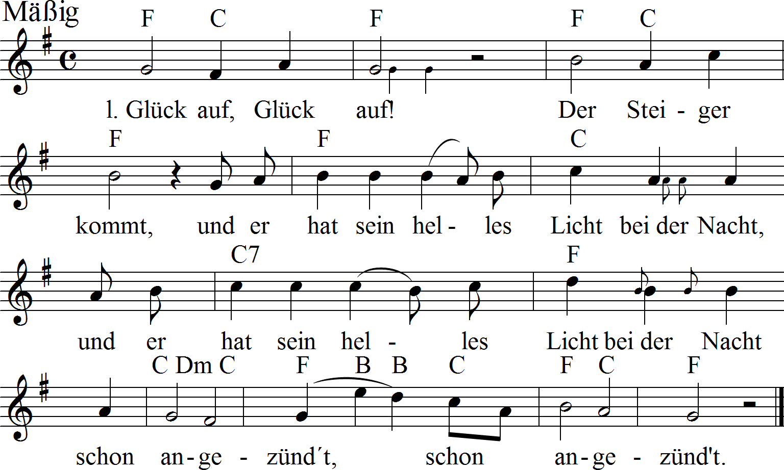 Glück auf, Glück auf! Der Steiger kommt. |: Und er hat sein helles Licht bei der Nacht, :| |: schon angezünd. :|