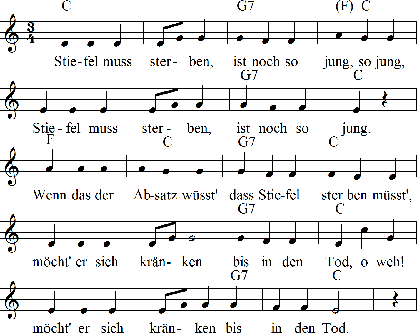 Stiefele muss sterben ist noch so jung, jung, jung Stiefele muss sterben ist noch so jung Wenn das der Absatz wüsst dass Stiefel sterben müsst Stiefele muss sterben ist noch so jung