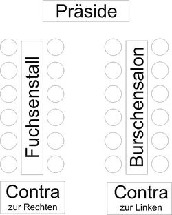 Im Gegensatz zum Kommers, wo das Präsidium aus fünf Bundesbrüdem (i.d.R. dem Vorstand) besteht und geschlossen seinen Platz an der Frontseite einnimmt, steht der Präside allein einer Kneipe vor. Seine zwei Contra sitzen an den Tischenden der beiden Zapfen. Der linke Zapfen ist der Fuchsenstall, der rechte der Burschensalon. Der Präside steht der gesamten Kneipe, die Contra jeweils ihrem Zapfen vor.